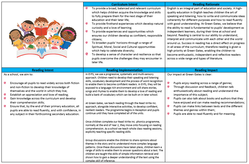 As soon as children begin their learning journey at Green Gates Primary School, they are taught using a systematic programme of phonics called Read Write Inc.