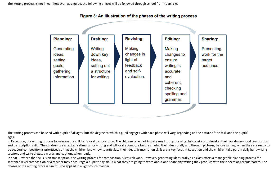 In Key Stage 1 and Year 3 and 4, pupils have discrete handwriting sessions for 15 minutes per day which focuses on making bodies stronger, fine motor skills and correct sitting positions. The children build upon foundational skills that they develop in EYFS in order to develop their formation and flow. Children will begin learning the skills needed to join in the summer term of Year two. Once in Year 3, children who are ready will join their writing. In Y5 and Y6, handwriting is consolidated, there is a focus on the flow of writing and any gaps in learning are addressed through their daily handwriting sessions. Once children reach this age, the comfort over conformity approach is taken with relation to pencil grip, provided the child has neat, joined, legible writing.