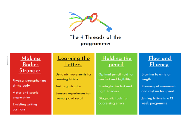 - Letters are learnt as movements, not as visual shapes, and movement remains central to developing automaticity in letter formation, flow and fluency.